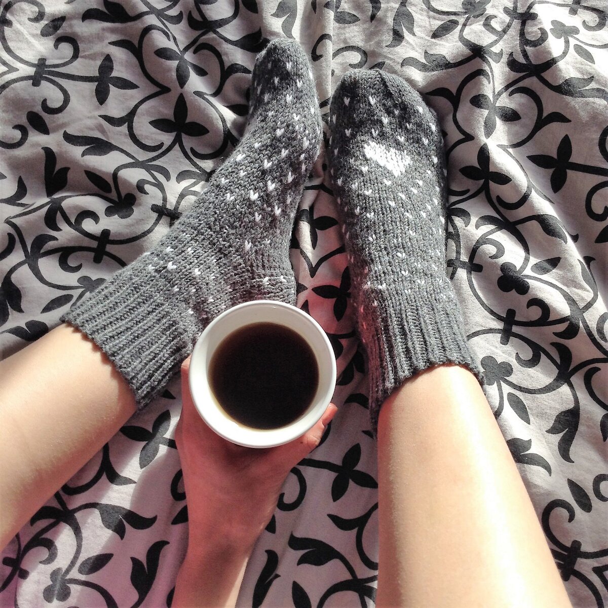 Эти носочки не только милые, но и очень теплые. Я даже не знаю, что сейчас важнее в наши-то холода: красота или тепло. Так как я все-таки девочка, то выбираю и то, и другое! На прошлой неделе морозы доходили до -40 (а кое-кто говорил, что даже до -50). Поэтому согреваться приходилось и чаем, и носками с сердечками. А еще они отлично подошли для празднования Дня Святого Валентина в условиях сибирской зимы. Кстати, благодаря такому вот элементарному жаккарду, носки получились значительно теплее из-за дополнительных нитей внутри.
