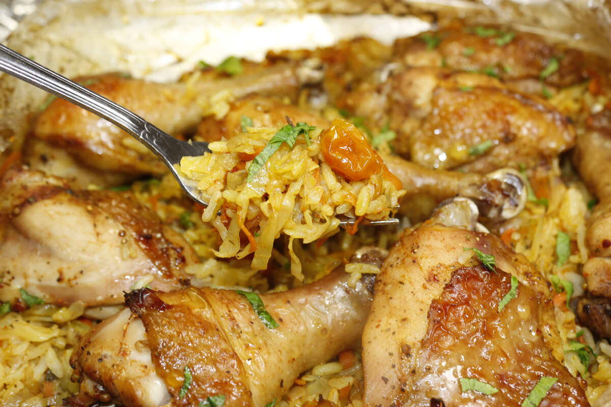 Приготовление: Очищаем и моем морковь и лук. Хорошо промываем рис. Теперь замаринуем мясо: куриные бедра и голени моем и просушиваем их бумажными полотенцами, добавляем к ним соль, перец, специи и соевый соус по вкусу, перемешиваем и оставляем мясо мариноваться.