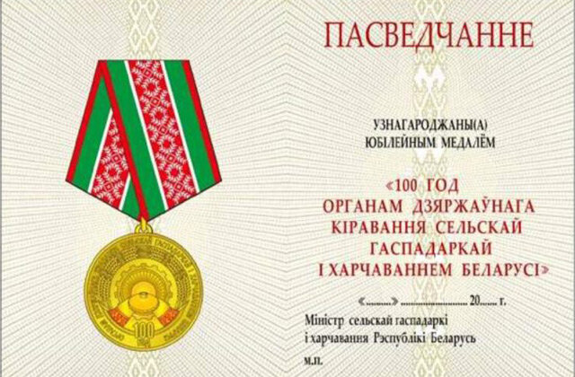 Народный Комиссариат Земледелия БССР был организован в 1919 году. В 2019 году Министерству сельского хозяйства и продовольствия РБ исполнилось 100 лет с момента основания. К юбилейной дате учреждена и выпущена медаль «100 лет органам государственного управления сельским хозяйством и продовольствием Беларуси». 12 февраля Президентом подписан соответствующий указ. Изготовление медалей оплачивается из республиканского бюджета. Медалью отметят отличившихся сотрудников органов управления системы Минсельхозпрода. Награждаются также ветераны труда, фермеры, лица, которые активно работают в сфере агропромышленного комплекса страны и способствуют его развитию. Вручает медаль лично министр сельского хозяйства и продовольствия. Надевать отличительный знак можно как на форменную, так и на гражданскую одежду, прикрепив ее на груди с левой стороны. 13 февраля принято решение об учреждении геральдических символов Минсельхозпрода РБ. У министерства появится свой отличительный флаг и эмблема. Работник
