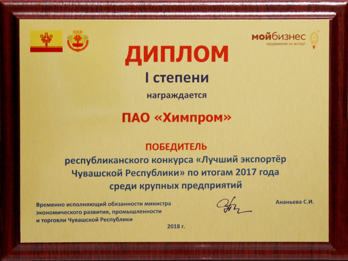 ПАО «Химпром» признано «Лучшим экспортером Чувашской Республики» по итогам 2017 года среди крупных предприятий. В декабре 2018 года состоялась торжественная церемония награждения победителей республиканского конкурса. В нем приняли участие организации региона, которые осуществляют производство товаров (работ, услуг) и постоянно наращивают экспортный потенциал, осваивают новые рынки сбыта продукции, эффективно используют возможности экспорта. Важные условия отбора победителей конкурса - это активность на внешних рынках и бизнес-результаты внешнеэкономической деятельности.