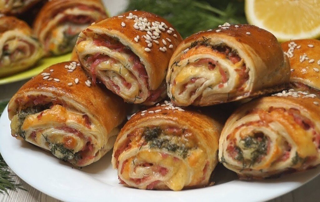 Яйца - 1 шт Тесто можно брать любое, как дрожжевое, так и бездрожжевое. Честно говоря, я особой разницы не заметила. Размораживаем тесто. Тем временем займемся начинкой для наших слоек. Сыр натираем на терке, добавляем измельченную колбасу. Колбасу берите любую, которая нравится. Можно использовать также сосиски или сардельки вместо неё. Мелко режем зелень и добавляем к колбасе и сыру. Перешешиваем, начинка готова! Тесто раскатываем, немного смазываем майонезом и выкладываем сырно-колбасную начинку. Сворачиваем рулетиком. Рулет переворачиваем швом вниз (шов хорошенько защипываем) и нарезаем на кусочки размером примерно 5-6 см. Сверху смазываем рулетики яйцом, слегка взбитым вилкой. Сверху можно еще немного кунжутом посыпат