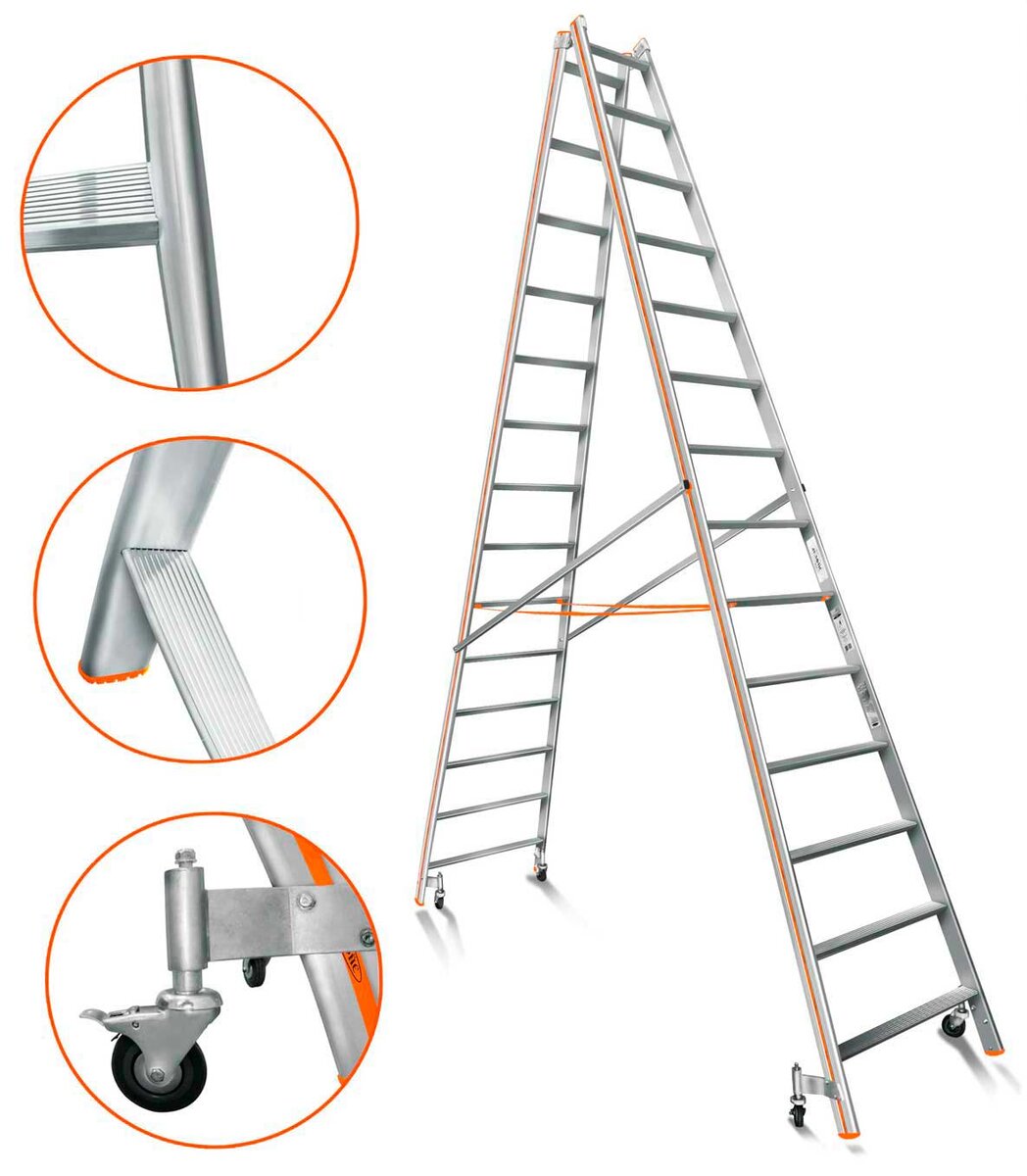 Выбираем стремянку Стремянки активно используются как на стройплощадке, промпроизводстве, так и в домашних условиях. Приобретать стремянку необходимо качественную и к ее выбору надо подходить ответственно. В противном случае можно получить увечье или травму, работая на ней. Стремянка должна обладать определенными свойствами и параметрами. Устойчивость Устройству не положено раскачиваться и быть скользким. Каждая ступенька должна быть надежным «плацдармом» для трудящегося на высоте человека. Он должен быть уверен в том, что ступенька не подведет и спокойно выдержит вес его тела. Поэтому специалисты советуют отдавать предпочтение изделию, имеющему достаточно широкие ступени. Качественная сборка Надежно и ответственно собранную стремянку отличает прочность сочленений всех имеющихся у нее деталей. Они, эти детали, должны быть сделаны ровно, скрупулезно и крайне аккуратно. Разнообразные вмятины, бугорки, заусеницы, сколы, деформации и прочие дефекты исключаются. Безопасное и комфортное прим