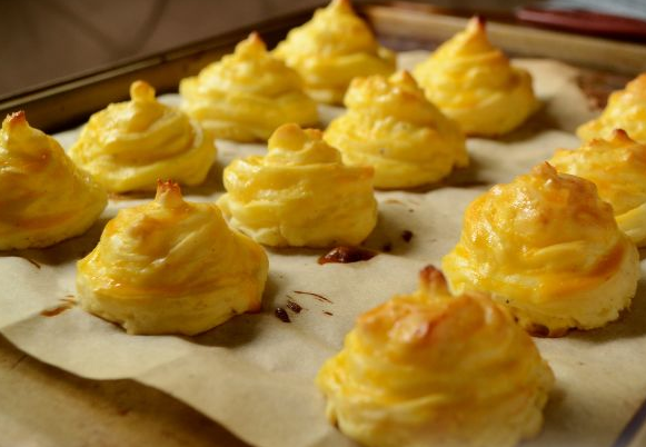 Oddiy masalliqlardan tayyorlangan ushbu gazak o'zining nozikligi va ajoyib mazasi bilan barchaga lazzat bag'ishlaydi. Ushbu gazak kechki ovqat yoki bayram dasturxonida barcha uchun manzur bo'lishi turgan gap. Kerakli masalliqlar : 1 kg kartoshka 50-100 gramm qattiq pishloq 2 dona tuxum sarig'i 0,5 choy qoshiq muskat yong'og'i kukuni Ta'bga ko'ra tuz va murch Tayyorlash usullari : 1. Tozalangan kartoshkaga sovuq suv quying, tuz soling va qatnating. Tayyor kartoshkadan sut qo'shib, pyure tayyorlang. 2. Pishloqni qirg'ichning kichkina tomonidan chiqaring. 3. Tuxum sarig'i, ziravorlar va pishloqni kartoshka pyuresiga qo'shing va bir xil konsistensiya hosil bo'lguncha aralashtiring. 4. Tayyorlangan kartoshka pyuresini maxsus konditer qopchasiga soling. Pergament qog'ozi solingan pishirish qolipiga kartoshka pyuresidan shakllar chiqaring va 200 darajada qizdirilgan gaz pechida 20-25 daqiqa davomida pishiring. 5. Tayyor gazakni darhol dasturxonga torting. Yoqimli ishtaxa !