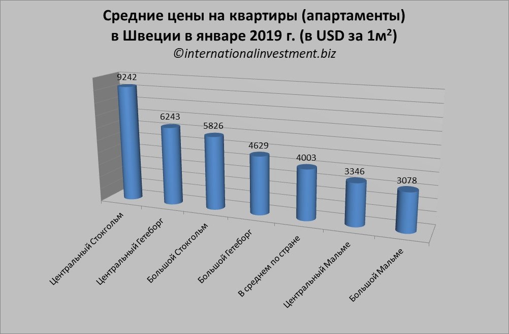 Цены на жилье в Швеции в январе 2019 года снизились за месяц, но остаются стабильными в годовом исчислении За последние три месяца (в ноябре 2018 г. – январе 2019 г.) в Швеции зарегистрировано 31 753 сделок купли-продажи жилой недвижимости – 21 552 квартир и 10 201 домов. Такие данные приводит статистический портал Mäklarstatistik. Домов для отдыха, для которых из-за малого количества продаж статистика высчитывается отдельно и только годовая, за последние 12 месяцев (февраль 2018 г. – январь 2019 г.) было продано 5 366. По стране В январе 2019 г. средняя стоимость квартир (апартаментов) в Швеции уменьшилась на 1% в сравнении с декабрем 2018 г. В квартальном исчислении (за последние три месяца) стоимость квартир снизилась на 3%. А за последние 12 месяцев (в сравнении с январскими ценами 2018 г.) апартаменты не изменились в цене. Средняя стоимость квартиры в Швеции составляет 37 229 крон ($4003) за квадратный метр. Дома (виллы) в Швеции в январе 2019 г. подешевели по сравнению с декабрем