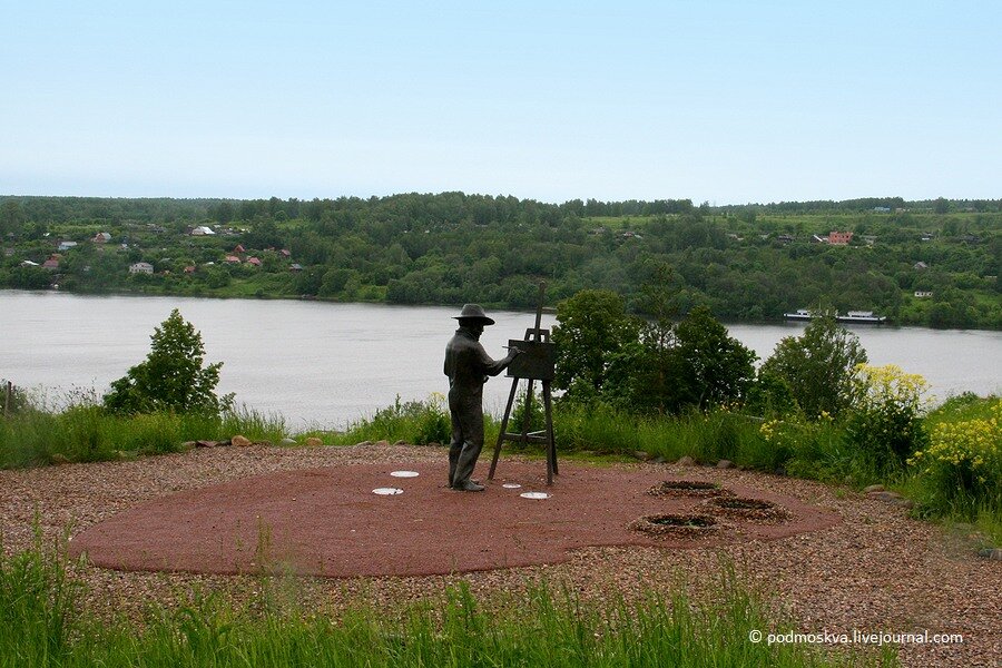 Одно из самых старинных и любимых туристами мест в прекрасном Плёсе Ивановской области - это гора Левитана, она же Петропавловская гора. С 16 века на этом холме стояла деревянная церковь Петра и Павла, которая потом была сожжена, а рядом располагалось старинное кладбище. Горой Левитана это место стали называть уже значительно позже, так как именно тут остановился великий художник, посетив Плёс. Конечно, в этом городке бывали и другие именитые художники и известные люди, но именно Исаак Левитан наиболее тесно был связан с Плёсом, написав здесь очень много своих великих полотен. "Над вечным покоем". Одно из самых известных творений Левитана. Мастер за работой навеки застыл в бронзе. Сейчас на горе как и тогда стоит небольшая деревянная церковь. Ее привезли сюда из села Билюково и установили взамен Петропавловской церкви, которую очень любил художник. У него и картина есть "Деревянная церковь в Плесе при последних лучах солнца". А это современная лестница на тропе Левитана. Она подн