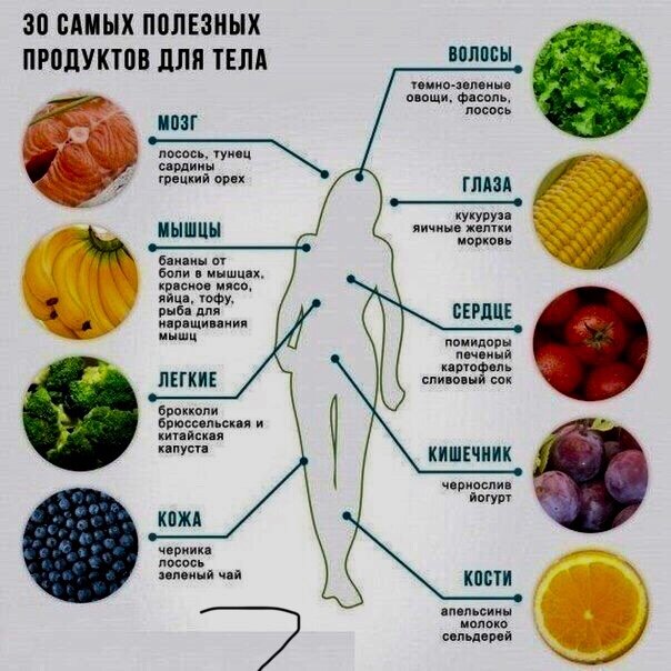 Для каждого органа есть свой список продуктов: Для мозга(лосось,тунец,сардины,гредский орех);Для мышц (бананы от боли в мышцах ,красное мясо,яйца,тофу(соевый сыр),рыба для наращивания мышц)Для кожи (черника,лосось,зелёный чай)Для волос (темно-зеленые овощи,фасоль,лосось)Для глаз(кукуруза,яичные желтки,морковь)Для сердца(помидоры ,печёный картофель,сливовый сок)Для кишечника (чернослив,йогурт )Для костей (апельсины,молоко,сильдерей).