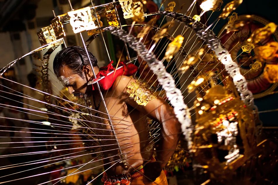Наверняка вы натыкались на снимки людей, которые протыкают себе щёки, языки и другие части тела длинными спицами, саблями и ещё много чем. Я тоже видел подобные фото, но как-то не сильно интересовался с какой целью всё это делается. Это не просто мазохисты или люди, которые таким образом самовыражаются, всё это - часть фестиваля Тайпусам. Тайпусам - дикий фестиваль посвящённый богу войны Муругану - сыну Шивы (это немного проясняет ситуацию с самоистязанием). Фестиваль отмечают тамильцы и малаялцы в день полнолуния месяца тай (январь\февраль) по тамильскому календарю. Проходит фестиваль в Индии, Сингапуре, Малайзии и на Шри-Ланке. В этот день Муругана осыпают поздравлениями и подношениями, дабы он услышал их молитвы. Весь фестиваль, как и любой другой индийский праздник, очень красочный, шумный и весёлый, не смотря на то, что он посвящён богу войны. Самым запоминающимся на празднике является ритуальное шествие кавади (kavadis), которое держит путь к храму Муругана. Кавади, что переводи