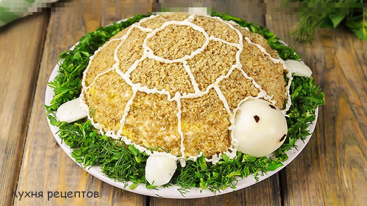 Основа кулинарного успеха этого блюда – красивое и очень оригинальное оформление, успешное сочетание ингредиентов. Приготовить его можно достаточно быстро. А самое главное его достоинство – незабываемый вкус. Дли изготовления 8-9 порций заранее приготовьте следующие ингредиенты: Вареная курица — 500 Гр. Яйца тоже вареные — 4 Шт. Сыр — 100 Гр. Лук зеленый (или репчатый) — 1 Шт. Зелень – для украшения Яблоко зеленое — 1 Шт. Чернослив — 100 Гр. Грецкий орех — 100 Гр. Майонез — 200 Грамм Как уже было отмечено выше, следует заблаговременно отварить курятину и яйца, хорошо остудить, что бы с ними было удобно работать. Все составные ингредиенты делим на два равные части, что бы можно было продублировать слои. Первую половинку вареных яиц (то есть 2) нужно оставить для черепашьей головы. У оставшихся яиц отделим желтки и белки. Белки нужно потереть на мелкой терочке, именно они будут первым слоем в салате. Его нужно смазать майонезом. Следующим слоем мы положим лук, который нужно предварите