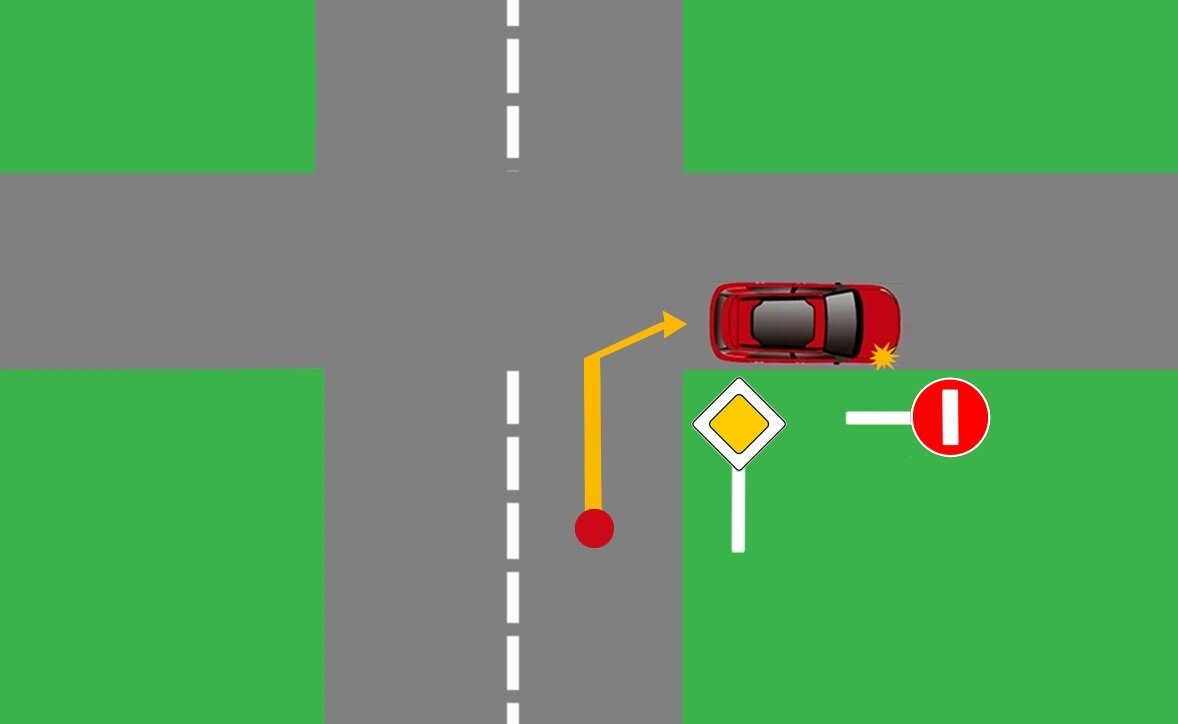 Водитель красной машины едет по главной дороге. Подъезжая к пересечению дорог, он решает повернуть направо, однако только совершив поворот видит перед собой знак "кирпич", запрещающий движение. Водитель останавливается прямо перед знаком и уходит по делам. Возвращается, а у машины стоит инспектор и срочно требует документики. Нарушил ли водитель ПДД в данном случае?