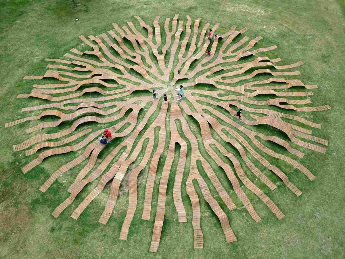 Проект Root Bench реализован студией Yong Ju Lee Architecture в рамках конкурса для парка Ханган в Сеуле, Южная Корея. Гигантская скамья диаметром 30 метров установлена на траве в городском парке и напоминает корни дерева, стирая границу между искусственной инсталляцией и окружающей средой. Благодаря различной высоте её элементов, отдыхающие могут выбрать для себя удобное положение, будь то сидя или лёжа. Скамья имеет три уровня и служит в роли детского стула (250 мм), взрослого стула (450 мм) и стола (75 мм). Проект Root Bench являет собой художественное произведение, разработанное с помощью компьютерного алгоритма и демонстрирующее динамичность трёхмерной геометрии. Металлическая рама с бетонным основанием поддерживает форму конструкции, а деревянные рейки покрывают её. источник: HQROOM — Архитектура и дизайн интерьера