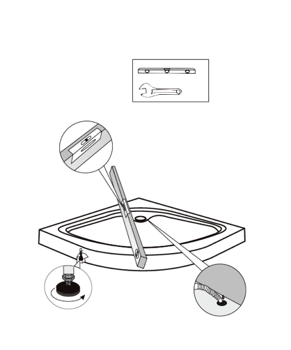 1. Установка поддона 2. Сборка каркаса 3. Монтаж задних стенок 4. Панель 5. Крыша кабины и Двери 6. Аксессуары Установка поддона И так, ставим поддон приблизительно там, где будет осуществляться весь процесс сборки душевой кабины. С помощью строительного уровня выровняйте по горизонтали и вертикал