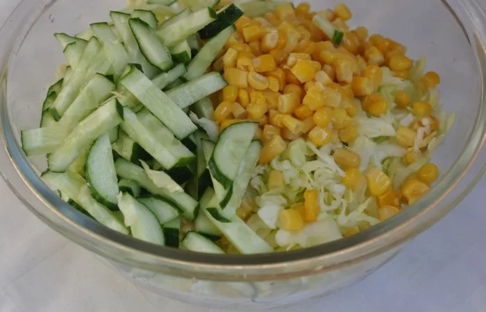 Вареные яйца нарежьте кубиками. Нашинкуйте пекинскую капусту и огурцы. Добавьте кукурузу. Заправьте салат оливковым маслом и перемешайте. Блюдо готово! Приятного аппетита! 😋 Не забудь поставить лайк, если тебе понравился рецепт! И конечно же подписывайся на канал, чтобы увидеть первым следующий рецепт :)