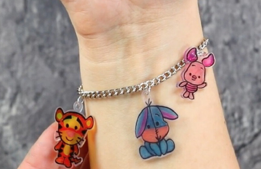 Привет всем! Многие наверное видели мастер классы как сделать подвески и брелки из пластиковых контейнеров. Их запекают в духовке при 150-170 градусах минуты 2-3 и получаются толстенькие, уменьшенные в размере подвески, как эти... Такие я пробовала делать, действительно происходит чудо - на глазах пластик сморщивается, затем уменьшается в размерах, становится толще и распрямляется. Только это происходит с пластиком на котором стоит маркировка PS 06. Пробовала сделать из бутылки 01 и пластиковой упаковки - все свернулось в трубочку...Так что берите контейнер! Но так как эти картинки раскрашивают маркером, цвета получаются не яркие, а мне хотелось сделать красочные картинки. Решила сделать таким образом. Берем пластик от упаковки (на предыдущем фото слева). От бутылки пластик не пойдет - сморщивается. Сверху прикладываем картинки на пленке, которые частенько встречаются на упаковках от игрушек. Такие бабочки были на пакете от сачка. Затем проглаживаем все утюгом через листок бумаги