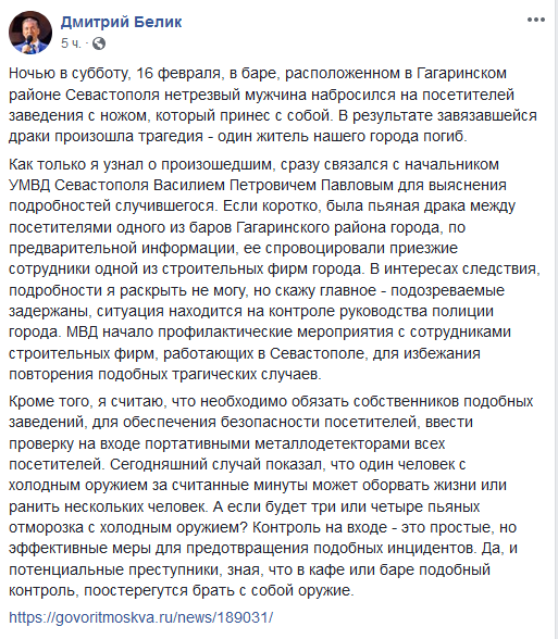 «Необходимо обязать собственников подобных заведений, для обеспечения безопасности посетителей, ввести проверку на входе портативными металлодетекторами всех посетителей. Сегодняшний случай показал, что один человек с холодным оружием за считанные минуты может оборвать жизни или ранить нескольких человек. А если будет три или четыре пьяных отморозка с холодным оружием? Контроль на входе — это простые, но эффективные меры для предотвращения подобных инцидентов. Да, и потенциальные преступники, зная, что в кафе или баре подобный контроль, поостерегутся брать с собой оружие.»