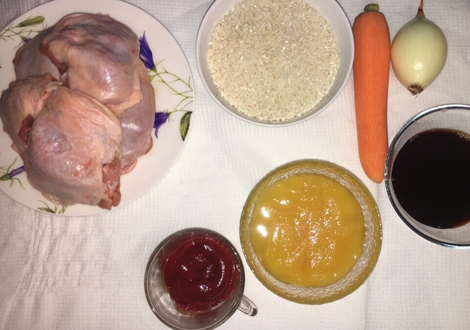 Бедра можно поделить на 2 части. В морковь и лук добавляем томатную пасту,жарим 5 минут и закладываем мясо. Обжариваем ещё 5 минут. Наливаем пол стакана воды,соевый соус,мёд. Перемешиваем,тушим 15-20 минут,до готовности. По мере необходимости добавляем воду. Добавляем соль,острый красный перец,черный перец. Рис промываем.