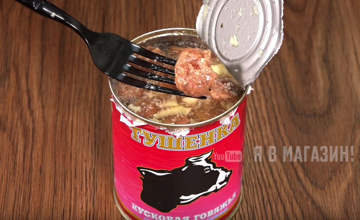 Среди баночек с тушенкой увидели на полочке в магазине вот эту. 25 рублей. Стало интересно посмотреть, что внутри. Я, конечно, понимаю, что ничего мясного там быть не может. Но почему в составе говядина указана? Причем, на первом месте. В общем, купили ради интереса. Открыли... Это, конечно... Смотрите. Вот здесь короткий видеоролик. Там все видно. Жаль, запаха не передать... Состав просто шикарен! На первом месте говядина, на втором - жир говяжий, соевый белок, вода, лук, манка и усилители вкуса... Открываем. Запах сразу показался неплохим, но когда ближе принюхались!.. Это что-то!.. Химией отдает и кислым борщом! Противно! Аппетит отбивает! Смотрим вес. 340 г А теперь взвешиваем... Воду слили. Остальное - на весы. 107!!! И все... Остальное - вода! Крашеная дурнопахнущая вода! Но то, что в тарелке - не мясо! Соя, наверное. Мягкие, как губка, кусочки. Внутри, к тому же, они другого цвета. Т.е. и красители присутствуют. В общем, нет в этой банки мяса(( Соя и вода. Попробовать не решили