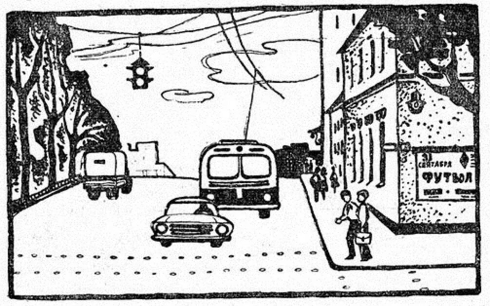 Найди 5 ошибок, которые допустил художник. Ответ читай ниже. 1. Автомобили движутся не по своим полосам. 2. У троллейбуса один "рог" (штанговый токоприемник). 3. В слове "сентябрь" допущена ошибка. 4. В сентябре не 31, а 30 дней. 5. У светофора не хватает одного цвета.