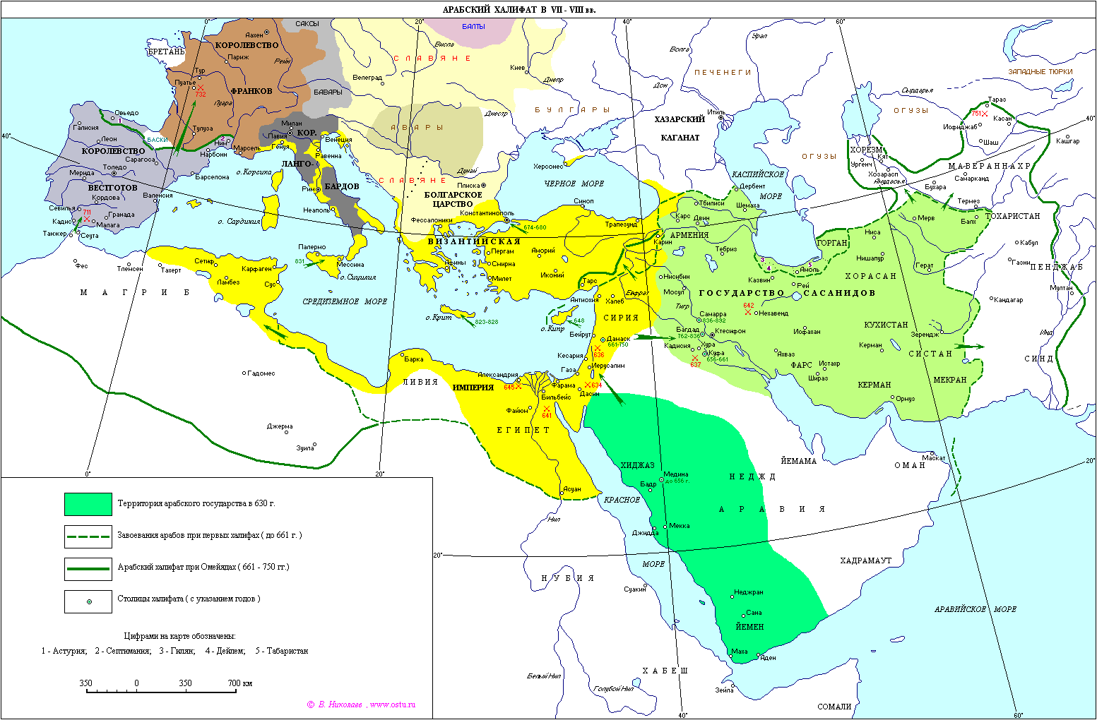 Прошу обратить внимание на красивое зеленое пятно на карте, которое располагается на Аравийском полуострове. Это - территория арабского Халифата в момент правления Мухаммеда (его имя, кстати, с арабского переводится как "восхваляемый"). А над ним две сверхдержавы того времени: Византия, с двадцатимиллионным населением, и Персия, чуть отстающая от своего желтого конкурента.