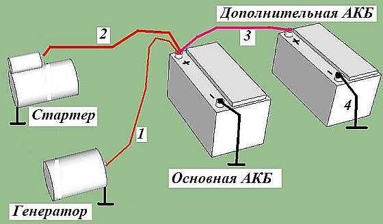 Способы соединения двух аккумуляторов: последовательное и параллельное Достаточно большое количество охотников, рыболовов и путешественников, в виду своего хобби, зачастую устанавливают на свои транспортные средства дополнительный аккумулятор. Это необходимо для того, чтобы энергия основного аккумулятора сохранялась, и в дальнейшем можно было уехать с места дислокации без приключений. Зачем необходим второй аккумулятор ? Областей применения второго аккумулятора великое множество: Как правильно соединить два аккумулятора? Для успешного осуществления данной операции стоит следовать следующим советам: Итак, постаравшись соблюсти данные рекомендации, можно cделать свой досуг на природе, на рыбалке, в походе или на охоте поистине красочным и незабываемым. Однако, нужно определиться со способами подключения двух аккумуляторов друг к другу. Первый способ: последовательное соединение: перемычка накидывается на клеммы: своя перемычка на «минусовые», своя перемычка на «плюсовые», далее оставши