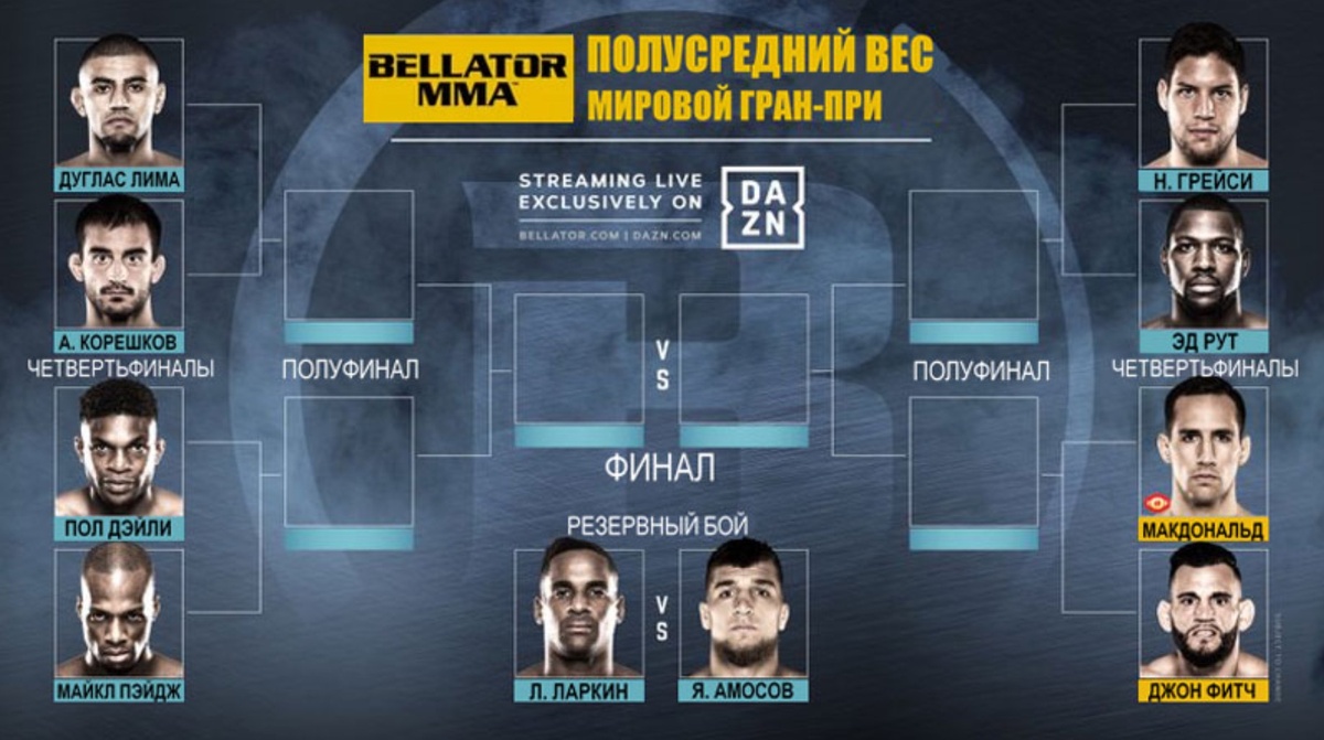 Гран-при Беллатор на данный момент лучшее, с точки зрения спорта, событие вне UFC. Стив Кокер собрал всех звёзд, каких мог, только Бена Аскрена не смогли переманить у Даны Вайта. Открыли турнир два хорошо знакомых друг другу бойца, Корешков в третий раз подрался с Лимой, и во второй подряд раз Омич оказался слабее. Очень похоже на печальный для нас конец этой истории. Затем, 15 декабря некий талант с рекордом 9-0 (8 sub) и не о чём не говорящей фамилией Грэйси задушил Эда Рута, тем самым вышел в сетке на победителя пары Макдональд – Фитч. А уже сегодня MVP, небитый талант из Британии, сойдётся со своим бывшим партнёром по команде, сверхопытным Полом Дэйли (40-16). Второе принципиальное противостояние ещё более знакомых людей. Закроет четвертьфиналы бой явного фаворита Рори Макдональда с тёмной лошадкой – Дэвидом Фитчем. Про красного короля мы все всё знаем, а вот его оппонент… Он бился в UFC, идёт на череде из 5 побед в топ лигах, ему 40, у него 38 боёв, хоть отбавляй опыта и определен