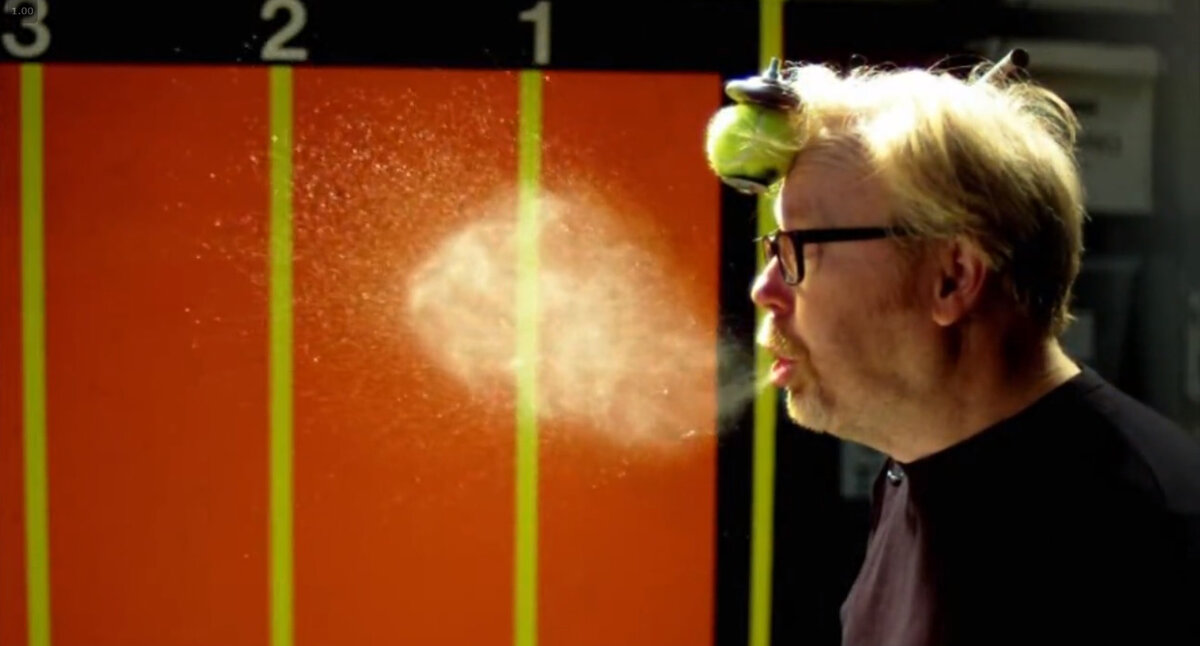 В мире нет ни одного полностью здорового человека. Каждый из нас хоть раз да поддавался натиску микробов и простывал, чихая и истекая соплями. Так вот, в этой статье речь пойдёт о мифе про чихание. Этот миф рассказывает нам, что при чихании слюни, сопли и микробы разлетаются на расстояние в 9 метров со скоростью 160 км/ч! Страшные цифры, правда? Если это так, то спрятаться от микробов болеющего человека очень сложно. Давайте разбираться правда это или же миф! Для этого этого эксперимента сделали 9-ти метровую линейку (31 фут), радом поставили стол, накрытый белой тканью. Испытуемые чихали на расстояние! Для стимуляции чихания использовался нюхательный табак. А чтобы слюни и сопли было лучше видно на белом измерительном столе - во рту у испытуемых был пищевой краситель. Самое дальнее расстояние, на которое удалось чихнуть составило 5,5 метров. Это конечно не 9 метров, но тоже достаточно далеко... А скорость полёта бактерий вычисляли таким образом: посчитали количество кадров, за котор