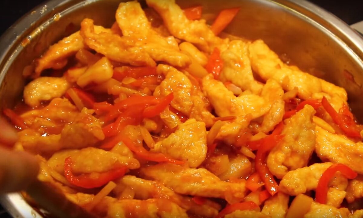 ● Вода — 2 ст. л Для начала приготовим кляр для курицы. Отделяем белок от желтка. (Нам потребуется только белок). Добавляем чайную ложку соли и соевого соуса, крахмал и одну ст.ложку воды и хорошо перемешиваем до однородности. Обычное куриное филе нарежьте некрупными полосками и обваляйте в кляре. Разогрейте ёмкость с маслом (примерно один стакан рафинированного масла), но следите, чтобы масло не начало дымить. И обжарьте филе. Не жарьте все полоски сразу, иначе они слипнутся, разделите на порции и закладывайте их по одной. Готовые куриные слайсы выклад
