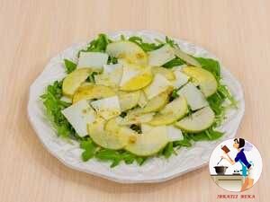 Nomlanishi noan'anaviy bo'lgan ushbu salat bayram dasturxoni va kechki ovqat dasturxoni uchun ajoyib tanlov. Tayyorlanishi oddiy va tayyorlash uchun barcha masalliqlar mavjud. Mazali va vitaminlarga boy bo'lgan ushbu salat barcha uchun manzur bo'lishi turgan gap. Buni albatta sinab ko'ring ! Kerakli masalliqlar : 200 gramm pishloq (pishloq turini hohishingizga ko'ra tanlang) 300 gramm nok Rukola salat bargi (boshqa salat bargidan foydalanish ham mumkin) Sous uchun : 50 ml o'simlik yog'i 1/2 apelsin 1 osh qoshiq xantal pastasi (gorchitsa) 1 osh qoshiq asal Tuz Tayyorlash usullari : 1. Pishloq va nokni katta bo'lmagan bo'laklarda, yupqa, parrak shaklida kesing. 2. Apelsin sharbatini chiqaring (100 ml). Chiqarilgan apelsin sharbati bilan o'simlik yog'ini birlashtiring. 3. Apelsin sharbati aralashmasiga xantal pastasi, asal va tuz qo'shing. Aralashtiring. 4. Salat tayyorlanadigan idishga rukolla salat bargini soling. 5. Salat bargi ustidan nok va pishloq bo'laklarini terib chiqing. 6. T