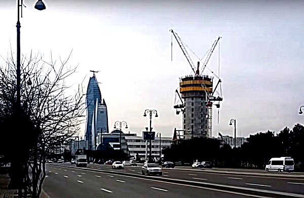 Проехав три четверти пути от Международного аэропорта имени Гейдара Алиева до Баку, мы остановились на футуристическом здании стадиона Интер Арена – до конечной точки нашего трансфера осталось совсем чуть-чуть. За 15-20 минут дороги, мы смогли ознакомиться с множеством интересных объектов, которые рассмотрели в трех статьях – разного цвета стрелки на карте: фиолетовая, синяя, зеленая. Настало время продолжить движение. Начнем мы его с места показанного на фотографии ниже, где мы можем видеть, уже известные нам: Интер Арену и высотку СОФАЗ (Нефтяного Фонда). Здесь же мы можем рассмотреть здание холдинга Азерсун – одного из лидеров продуктового рынка Азербайджана (производит продукцию 28 брендов). Напротив здания холдинга, справа по ходу движения, можно будет увидеть еще один интересный объект – автозаправку. Помимо вычурного оформления, она интересна своими светящимися часами. Сразу за заправкой идет пока неизвестная строящаяся высотка и здание Комитета по имущественным вопросам. Буквал