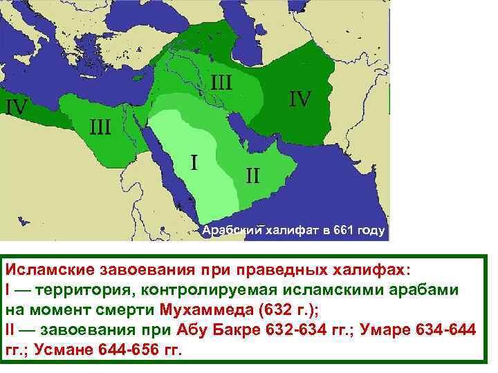 Начать стоит с того, что создателем Арабского халифата был пророк Мухаммед. После его смерти пост главы государства начали занимать халифы (наместники пророка на Земле). Лично знакомых с пророком халифов было четверо. Карта Арабского халифата, при них, менялась таким вот образом: