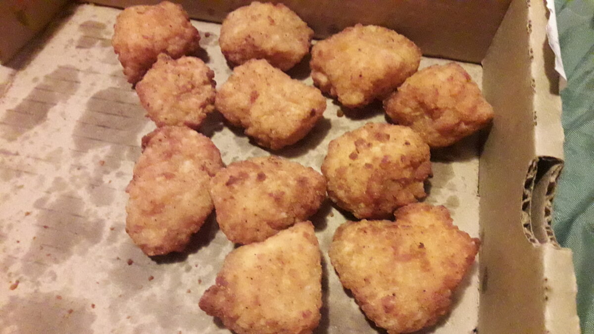Не так давно у Papa John's появилась новинка - Горчичная пицца! Собственно мы ее попробуем, а чтобы добавить текста и фото, попробуем еще пару позиций. Ну начинаем, процесс заказа я описывать не буду, все стандартно: сайт, затем заказ, затем получение заказа через восемьдесят минут. Но вот что я отмечу, так это то что на сайт появился виджет отслеживания заказа - это прекрасно. А вот то что он не работает - это ужасно. В общем виджет показал стадию "передаем заказ", а через несколько секунд "заказ доставлен". Ну перейдем к еде, начну с позиций для эффекта толпы. Чикен Попперс (11 штук, 349 рублей) Простите что? Одиннадцать наггетсо - подобных кусков курицы за 349 рублей??? У меня есть ощущение что я стал фигурантом какого-то дела о мошенничестве. Дают один бесплатный соус, но за такую цену меня этими соусами с ног до головы обмазать должны были. Сами попперсы скучные, корочка не хрустит, а курочка суховата. Обман. Пицца сырная 30 см (449) Ну вот тут неплохо. Все пиццы связанные с сыро