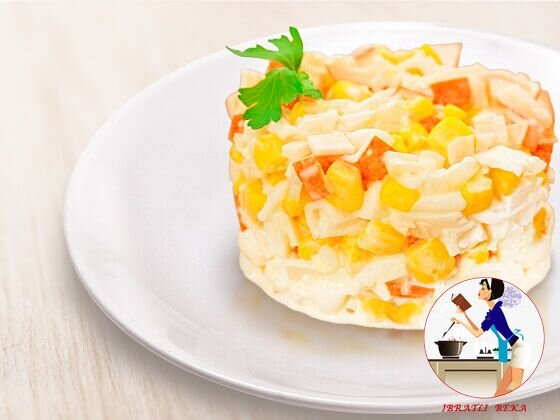 Nomlanishi noan'anaviy va vitaminlarga boy bo'lgan ushbu salat tayyorlanishi oddiy, tayyorlash uchun barcha masalliqlar mavjud. Mazali, vitaminlarga boy ushbu salat kechki ovqat yoki bayram dasturxonida barcha uchun manzur bo'lishi turgan gap. Kerakli masalliqlar : 240 gramm qisqichbaqa tayoqchasi 340 gramm makkajo'xori konservasi 3 dona tuxum 150 gramm piyoz Mayonez Tayyorlash usullari : 1. Piyozni tozalang va mayda to'rtburchak shaklda to'rg'ang. Piyozni 10 daqiqaga qaynoq suvda uyuting. So'ng, sovuq suvda yuving. Bu piyoz achchig'idan xalos bo'lish uchun. 2. Qisqichbaqa tayoqchalarini mayda shaklda to'r'gang. 3. Qaynatilgan tuxumni qirg'ichning katta tomonidan chiqaring. 4. Tayyorlangan masalliqlarni birlashtiring, ta'bga ko'ra tuz soling. Makkajo'xori konservasini soling. 5. Mayonez solib, aralashtiring. Birzumda rangorang, mazali salat tayyor ! Darhol dasturxonga torting. Yoqimli ishtaxa !
