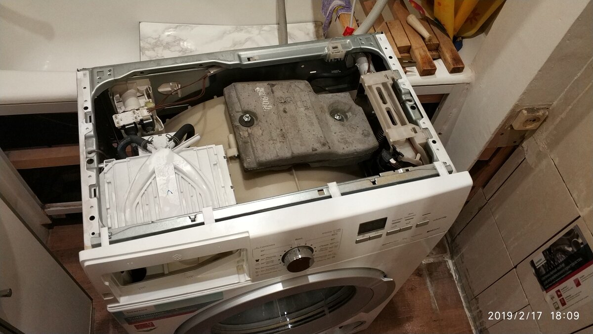 Ремонт СМ Siemens IQ500 Ну вот и пришёл тот час, когда стиральная машина забарахлила. Основные симптомы - время стирки на разных режимах стало разниться, может стирать более часа сверх положенного по программе. Немного полистав интернет-ресурсы, я понял, что дело в ТЭНе. Это подтвердил натурный опыт, во время программы стекло люка всегда было холодное. Далее были отложены все дела, даже лыжи, и я приступил к разборке машины. К сожалению, в интернете везде говорится о том, что на "немцах" доступ к ТЭНу осуществляется путем снятия "фасада" машины. Я так и сделал, сняв панель управления, верхнюю крышку и панель с люком, со зловредным разъёмом и открутив 2 винта внизу машины, для чего пришлось положить её на бок. В итоге, никакого ТЭНа я там не нашёл. Это я уже собрал аппарат обратно, только крышка верхняя осталась. Тогда я открутил заднюю крышку, а немцы её добротно сделали, и обнаружил искомый элемент. Он располагается чуть выше и левее мотора барабана. Вытащить ТЭН можно открутив га