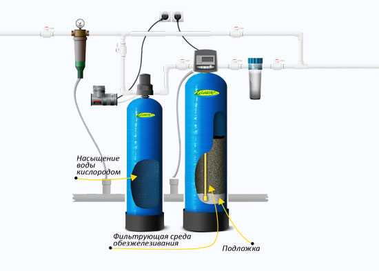 Во многих ситуациях, где ОВП может быть поднят выше 200 милливольт с помощью только аэрации, химическая регенерация или введение хлора или озона не требуется. Аэрационная очистная установка будет включать в себя подачу воздуха под давлением, когда вода протекает через резервуар с растворенным воздухом. Это увеличивает концентрацию растворенного кислорода в воде и интенсифицирует процесс окисления железа и марганца с последующей их сорбционной фильтрацией на пористых фильтрующих загрузкой и дальнейшим смывом в канализацию с дренажной водой при очередной регенерации фильтра.
