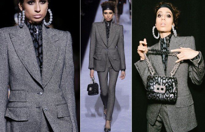 Многие женщины работают в офисах или на предприятиях, где нужно соблюдать деловой стиль. Иногда костюм – это единственный вариант дресс-кода. Конечно, девушкам хочется выглядеть одновременно стильно и сдержанно. Если правильно подобрать оптимальные модели, то костюмы никогда не наскучат и будут удобными повседневными комплектами. Модные тенденции 2019 года Главный тренд этого года – строгий брючный костюм в мужском стиле. Стилисты обозначили ряд характерных деталей, которые должны быть у образов: широкие мужские «плечи» и лацканы. Давайте рассмотрим, что нам предлагают носить известные дома моды и дизайнеры. Том Форд. Кутюрье представил на показе коллекцию женских костюмов. В нее вошли приталенные серые пиджаки с подплечниками и имитацией карманов, а также узкие брюки-дудочки. Кроме того, модельер разработал ряд смокингов (белого и черного цвета) с атласными и шелковыми лацканами. Жан-Поль Готье. Кутюрье показал жакеты и пиджаки различных моделей: оверсайз, с баской и широким поясом