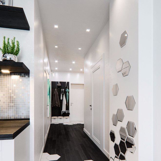 Малогабаритные квартиры не отличаются простором в прихожих. Дизайнеры предлагают воспользоваться специальными приемами для визуального расширения пространства в этих помещениях. В нашей статье расскажем о самых популярных методах. Отделка стен Светлая отделка расширяет пространство в любой комнате. Не бойтесь использовать в прихожей отделку светлых тонов. Выбирайте моющийся материал. Это позволит поддерживать чистоту в зоне повышенной проходимости. Отражающие поверхности Если прихожая позволяет уместить шкаф, сделайте его двери зеркальными. Напротив зеркального шкафа-купе разместите декоративные панно в светлых тонах. Отражаясь, они создадут эффект глубины и нивелируют пустоту. В отсутствие зеркального шкафа повесьте зеркало на одной из стен. Дополнительными отражающими поверхностями станут глянцевый потолок, зеркальные декоративные панели на стенах, металлическая фурнитура, гладкие поверхности мебели, светильников и аксессуаров. Гладкий пол с поперечным рисунком - еще один прие