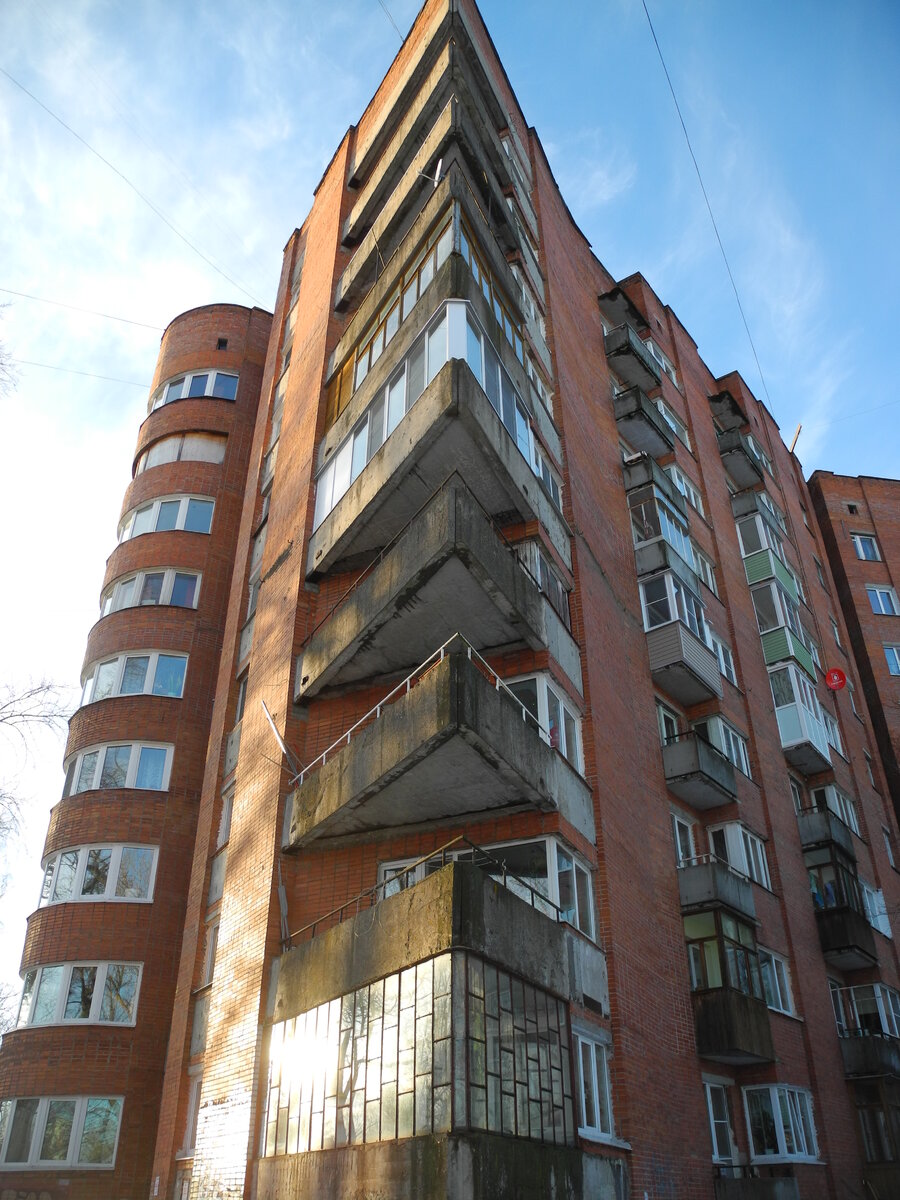 Ещё 10 фотографий модернистского дома с Маяковским из предыдущего поста — здание поразило: краснокирпичный трёхлистник с острыми балконами и круглыми эркерами. Это улица 1 Мая, 22: раньше тут (или рядом) был католический костёл — его построили в 1910 году: тоже, кстати, краснокирпичный — после войны служил жилым домом. Пишут, что снесли бывший костёл в 1978 году: «"помешал” новому строительству в Шлиссельбурге». Дом-«Бастилию» (так, если верить «Викимапии», его называют местные жители) построили как раз в 1978-м — а начали вроде бы за шесть лет до того. Получается, он ровесник бофилловского Walden 7 (1975 год). Девять этажей, 108 квартир, одна парадная. По три длинных коридора на каждом этаже — они впадают в площадку у лифта. При входе, в колясочной, кто-то организовал лежанку для котиков — благоухание достигает второго этажа. Мусоропровод заварен. Стены, двери, окошки, как в бассейне или на заводе, — исписаны матом и стихами: кажется, косметического ремонта не было давно (или нико
