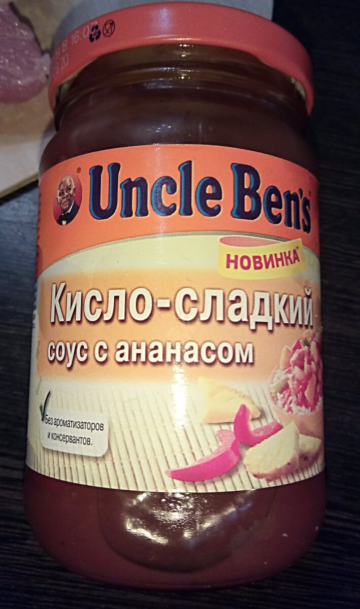 имбирь, кориандр, гвоздика, черный перец, чили перец. Густой яркий соус с кусочками овощей и ананасов. Пахнет приятно. Очень вкусный и без готовки. На одну маленькую банку нужно нарезать 300 граммов мяса и обжарить минут 10. Добавить соус, перемешать и тушить ещё минут 10. Блюдо получается яркое, с нежным запахом и очень приятным оригинальным вкусом. Мясо быстро размягчается под воздействием кислой среды соуса, пропитывается его ароматами. Моё впечатление - буду брат