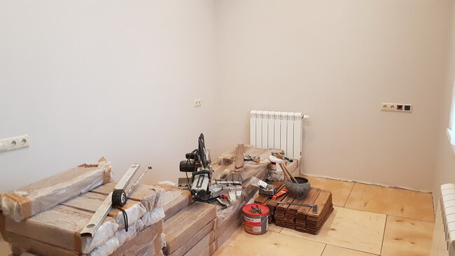 Завершились выходные. Честно - в этот раз у нас с братом все из рук валилось, поэтому минимум работы было сделано. 1. Начали делать паркет в гостевой комнате на первом этаже. Сделали половину комнаты. комната до: вид из комнаты: а тут первые 3 ряда паркета: Самое главное за выходные -- выбраны двери! список для первого этажа: двери - дерево. тяжелые, массивные! дизайн такой: а вот цвет их, чуть темнее стен. К сожалению фотографии не передают оттенок, но, уверен... все должно быть хорошо! Цена дверей 55 тыс. руб (4 штуки в полном комплекте + 2 добора на входную дверь и проем в зал). Ручки к дверям не заказывал, тк они будут куплены отдельно под стиль ручек кухни: Читайте также: №1. Пустой участок и начало строительства №2 Проект дома из Газобетона №3 Первые строения. Туалет и Бытовка №4. Фундамент №5. Скважина и блоки ИТОНГ №6. Крыша №7. Входная дверь и окна №8. Септик №9. Внутрянка. Бойлерная №10. Кухня. Начало №11. Стильная кухня? Выбор фирмы №12. Паркет в кухню? №13. Ставим кух