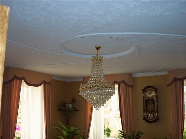 Гипсокартон на потолок. Однажды хозяйка усадьбы на которой мне приходилось заканчивать ремонт, предложила мне прокатиться в соседний поселок чтобы посмотреть как местному олигарху пацаны крутят гипсокартон на потолок. Поначалу я засомневался, что можно показать особенного мне, который съел не только собаку с потолками и гипсом. У них в доме не совсем высокие потолки, где то 250см, а ей хотелось на потолке иметь много уровней и чтобы не сильно большими уровнями. Я объяснил что минимальная толщина или высота уровня - 3см, всё! по другому никак! Однако когда мы приехали на эту хваленую стройку, то я был действительно удивлен. Уровни составляли толщину гипсокартона, то есть от 15см до 8мм! Технология довольно проста. Сначала прикручивают лист на первый уровень, но расстояние между обрешеткой заполняют фанерой. Можно нарезать квадраты фанеры толщиной от 5мм, по размеру проемов в обрешетке и просто закинуть их под уже прикрученный лист. Теперь следующий уровень, можно прикручива