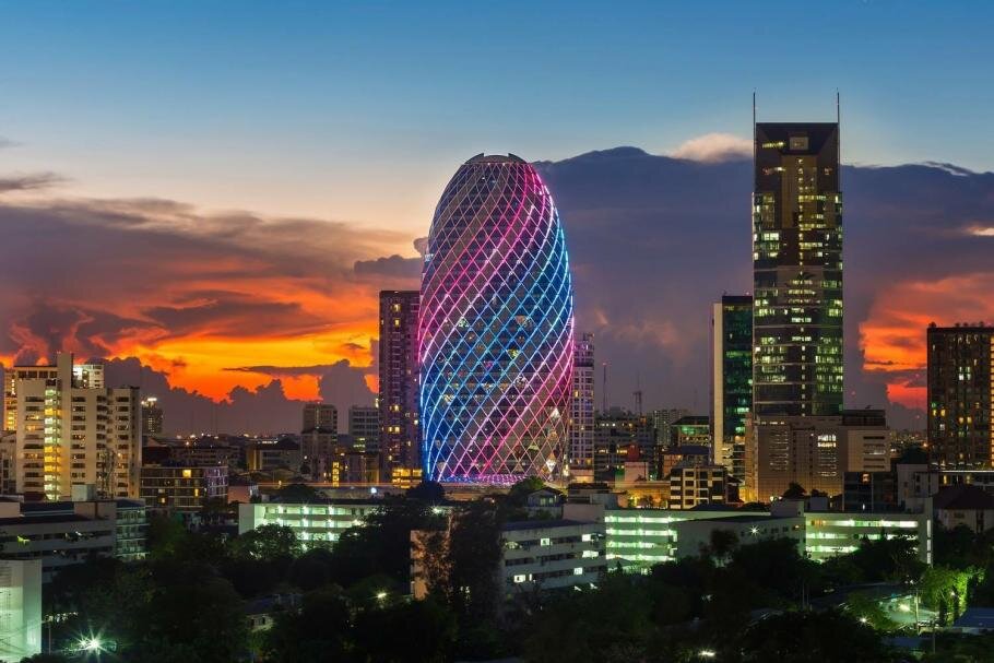 Рассказываем о реализованном в Таиланде ярком проекте светодиодной подсветки необычного небоскрёба от наших партнёров - немецкой торговой марки Traxon e:cue Osram. Сам бизнес-центр The Pearl Bangkok был создан с мыслью стать центром притяжения взглядов, и освещение нужно было такое, что бы реализовать потенциал здания и ослепить всех его сиянием. Здание овальной формы было названо Жемчужина" с пониманием, что станет достопримечательностью Бангкока, одного из жемчужных городов Азии. Каждую ночь The Pearl освещает ночное небо в городе Бангкок. Экологическая и "зелёная" тема пронизывает всю «Жемчужину», от кондиционирования воздуха и использования воды в здании до самого освещения. Великолепная башня была украшена подчёркивающими красоту архитектуры динамическими светодиодными светильниками, которые управляются по-настоящему энергоэффективно при помощи дисплея, со сниженным потреблением энергии на 60 процентов по сравнению с традиционными люминесцентными лампами. Расположенный в Ари, цен