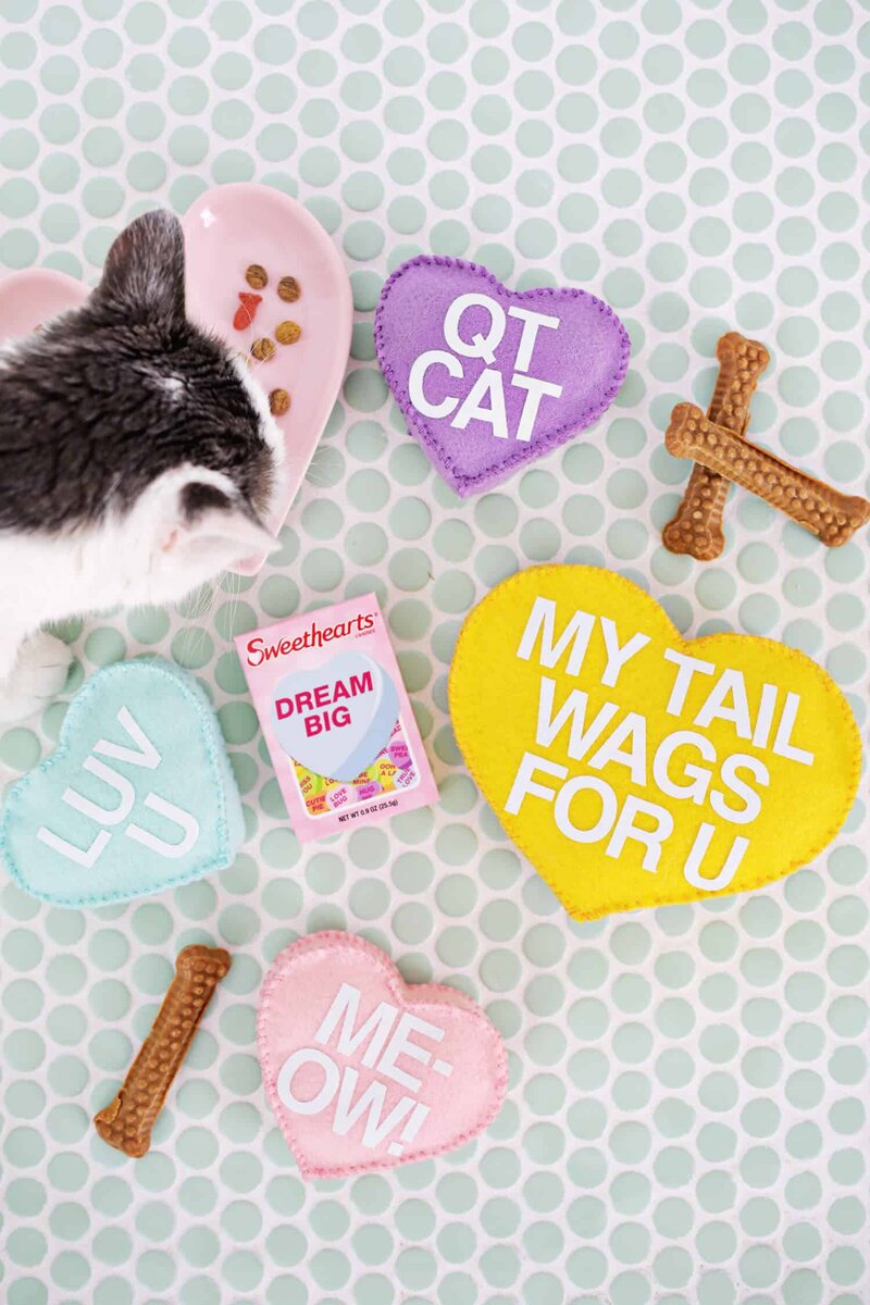 И хотя День Святого Валентина позади, для проявления любви и заботы всегда есть повод. Если у вас есть кошка или собака, эти игрушки-сердечки - отличный подарок, чтобы показать вашему малышу, насколько вы заботитесь о нем! Нам понадобится: Распечатываем шаблон сердца и ножницами вырезаем 2 сердечка из фетра и одну длинную полосу для боковой стенки игрушки. Разместить буквы на изделии с внешней стороны. Приутюжить на низкой температуре. Можно попробовать на небольшом кусочке войлока, чтобы проверить как поведет себя шерсть. В зависимости от качества шерсти, возможно понадобится проложить вафельное полотенце между фетром и утюгом. Совмещаем конец полоски с нижним кончиком сердца и сшиваем детали нитками мулине обметочным (петельным) швом по всему контуру сердца. Как только дойдем до конца, не обрезая нитки прошиваем боковой шов и продолжаем пришивать второе сердце. Оставляем отверстие примерно 3 см для набивания игрушки Для набивания игрушки для кошки используем наполнитель для мягких