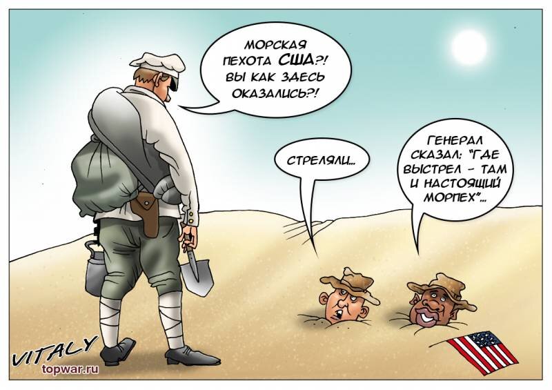 Чтобы американскую армию боялись еще больше, в нее разрешили набирать геев. Мировые диктаторы содрогнулись от мысли попасть в плен к американским морпехам. Три американских морпеха едут на джипе по дороге из Басры в Багдад и увидели на обочине бездыханное тело еще одного морпеха. Они остановились и подошли к телу. Морпех оказался живым, но хорошо помятым и без сознания. В нескольких метрах от него они увидели тело иракского повстанца, в таком же состоянии. Оказав обоим первую помощь, они привели морпеха в чувство и спросили, что случилось.