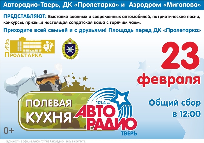 День защитника Отечества предлагают отметить вместе организаторы праздника - Тверской областной Дворец культуры «Пролетарка», Аэродром «Мигалово» и «Авторадио - Тверь» на «Территории Творчества» 23 февраля с 12.00 до 14.00 со всеми поколениями жителей Твери и области. На центральной уличной площади перед Дворцом культуры развернется «военно-полевой лагерь» для настоящих мужчин всех поколений, а также членов их семей и гостей праздника. Выставка боевых возможностей Реактивной артиллерийской бригады и современной техники от автосалонов Твери. Авиационные средства спасения, «парашютная» фотозона от Аэродрома «Мигалово». Армейская каша с гречкой, тушенкой, морковью и луком, сваренная по - мигаловскому рецепту, и горячим чаем для всех желающих - от «Авторадио-Тверь». И все это под музыку народного духового оркестра п.Калашниково Лихославльского района. Также, украшением Дня защитника Отечества станут выступления лучших творческих коллективов и солистов «Пролетарки», с