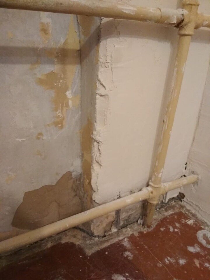 На этой квартире полностью переделывать стены не пришлось, видимо сверху квартиру топило нечасто и перекрытия не нарушились. Единственные места, где штукатурили по маякам - стены у оконных проёмов, и то, в большей степени не потому, что старая штукатурка отваливалась, а из-за слишком большой кривезны откосов и самих стен. Стены были выровнены визуально, с хорошей экономией на материале и при этом без