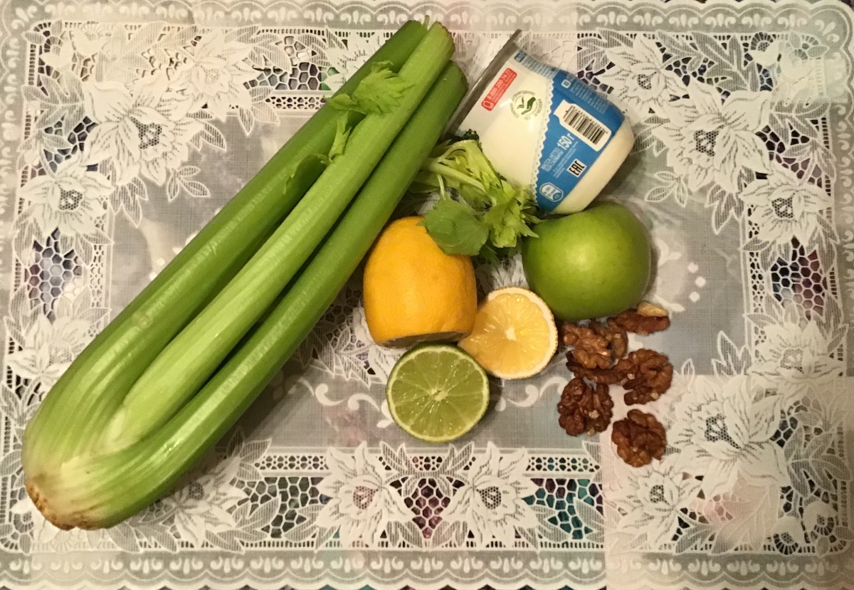 Этот салатик подарит нам 1) здоровье; 2) красоту; 3) молодость и поможет похудеть! Каждый ингредиент этого салата - сам по себе кладезь полезных веществ. А вместе они образуют мощный тандем, благодаря которому он будет воздействовать на организм с такой силой, что это будет настоящая витаминная бомбардировка! В салате удачно сочетаются полезные продукты. Следующий текст надо читать голосом ведущего боксерские бои или бои без правил))): «В левом углу ринга в салатовом трико рекордсмен по содержанию витаминов и микроэлементов, овощ с отрицательной калорийностью, чемпион по жиросжиганию, знакомьтесь: СЕЛЬДЕРЕЙ! В правом углу ринга в зеленом пальто - Яблоко! Весь вечер на ринге - грецкие орехи и натуральный йогурт. Поддерживают наших бойцов лимон и лайм (своим соком).» Как я уже написала, сельдерей - настоящая находка для человека, следящего за своим здоровьем, а уж для худеющего человека - вернейший друг. В нем столько полезного: и витамины группы В, и микроэлементы (в том числе соеди