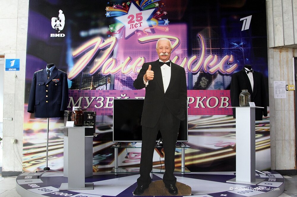 Раньше, когда я смотрел передачу «Поле чудес»… Не удивляйтесь, 25 лет назад эту передачу смотрела вся страна, я не был исключением. Так вот, когда я слышал про музей подарков, представлял себе огромный ангар, в котором стеллажи сверху донизу забиты костюмами, банками и сувенирами. Потом стал думать, что это специально так говорят, на самом деле никакого музея нет. Но музей подарков «Поле чудес» действительно существует. Сейчас он расположен в телецентре Останкино. Я покажу, что там есть. Экспонаты выставлены в одном из фойе в стеклянных витринах. Очень много всяких поделок. Кроссворды во всех вариациях. Культ личности Якубовича. Фигурок, изображающих ведущего очень много. На табличках указаны занимательные факты из истории передачи. Якубович ведет передачу с 1991 года. Масляков еще дольше, но у Маслякова нет такого музея подарков. Богата талантами земля русская. Да тут можно историю изучать. Референдум-2003 «Чечня в составе России». Немного оружия. 11. Немного космонавтики. Рейтинги