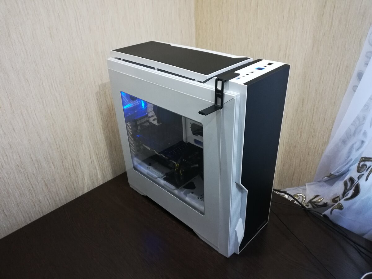 Рассмотрим очень не дорогой и красивый корпус Deepcool Dukase V3 ! Производится в двух цветах (белый и черный) на примере будем рассматривать белый. Корпус за свои деньги достаточно большой и оснащён доп функциями которых нет у конкурентов в такой ценовой категории . Размеры его составляют (длинна-482мм ширина-202мм высота-504мм) Весит почти 7.5 килограммам, показывая , что даже на бюджетных корпусах бывает используют металл не в виде жестяных банок ! Магазинная упаковка в виде коробки не имеет ни каких ручек, нести его очень не удобно в виду его не малых размеров. Девайс довольно симпатичный и имеет не обычную внешнюю форму которая точно понравиться хозяину и гостей не оставит без внимания. Имеется боковое окно с оргстекла, с левой стороны, что даёт вид на все внутренности пк и довольно не плохой 120 мм куллер с синей подсветкой кстати в комплекте их 2, один на задней стенке другой в передней , но скрыт под толщей сетки из пластмассы (максимально же можно установи