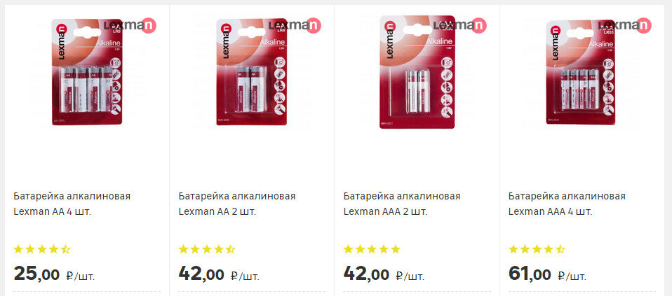 Lexman - собственный бренд Леруа Мерлен. Под этим брендом продаются дешёвые и хорошие светодиодные лампы (ammo1.livejournal.com/937494.html). Батарейки Lexman АА по цене бьют все рекорды - это почти вдвое дешевле всех остальных предложений. Даже солевые батарейки (которые гораздо хуже любых щелочных) часто продают дороже. Удивительно, но упаковка из двух таких батареек стоит дороже, чем упаковка из четырёх - 42 руб. Батарейки Lexman AAA стоят не так дёшево - 61 руб за 4 штуки (15.25 руб за штуку). Это сравнимо по цене с дешёвыми батарейками в других сетях магазинов.