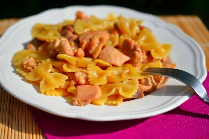 8. Добавьте готовые фарфалле к курице, плюс добавьте 50 мл воды, в которой они варились.