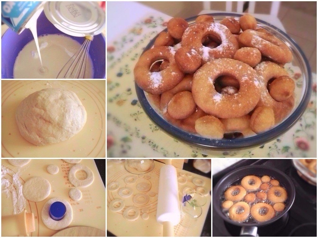 После чего, достать тесто, скатать в колбаски шириной примерно 3 см, и нарезать на кружочки и скатать в шар. По центру каждого шара сделать отверстие. Либо раскатать в пласт, прорезать стаканом круги.